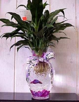 A clear glass vase adorned with river rocks below contains a Peace Lily Plant and a Betta Fish. The lily's roots hang down into the vase providing natural water filtration where the betta is kept. Available only in New York City at the moment.