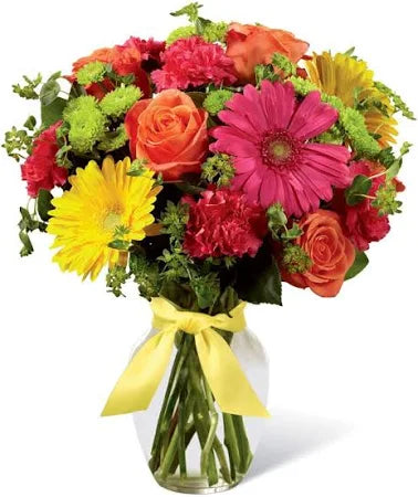 Orange roses, hot pink gerbera daisies, yellow gerbera daisies, hot pink carnations, green button poms, bupleurum, and lush greens in a classic clear glass vase, accented with a yellow ribbon around the vase.