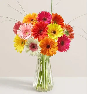 A vase of gerbera daisies is typically a vibrant and cheerful arrangement featuring large, daisy-like flowers in a variety of colors, often with a touch of greenery, all displayed in a clear glass vase. The gerbera daisies, known for their bright and bold colors, are the focal point, with stems visible through the glass. The arrangement is often designed to be a source of joy and can be used to brighten up any space or occasion.